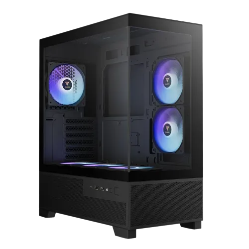 The panoramic tempered glass front panel offers a stunning view of the interior, showcasing six preinstalled 120mm ARGB fans that deliver vibrant lighting and exceptional airflow. With a sleek black finish and dimensions of 415 x 220 x 470mm, this casing accommodates powerful components, including GPUs up to 410mm in length.