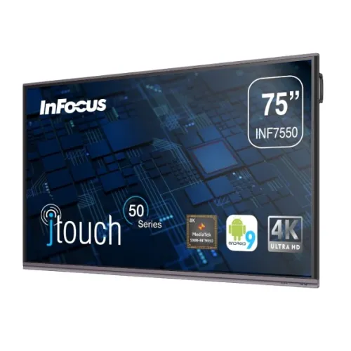 The InFocus INF7550 features a 75″ 4K Ultra HD display with a high contrast ratio of 1200:1 and a fast response time of 8ms. Its advanced touch system supports up to 40 touch points, making it perfect for interactive presentations and collaborative work.