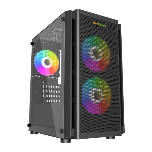 Build your dream battlestation without breaking the bankthe MaxGreen 5510Mesh midtower gaming case delivers highquality airflow, durable build, and premium design that fits your needs perfectly. The mesh front with three preinstalled ARGB fans guarantees bestperformance cooling, while the fullsize temperedglass side panel turns your RGB components into a vivid showpiece.
