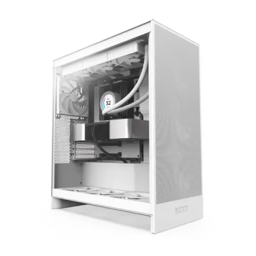 The NZXT H7 Flow White case features extensive cooling options, including support for up to 420mm radiators in the front, 360mm on top, and 140mm in the rear. With 3 preinstalled 120mm fans and the capacity to accommodate up to ten fans, you can enjoy superior cooling performance. The case dimensions are 544mm high, 244mm wide, and 468mm deep, providing ample space for highperformance components such as graphics cards up to 410mm long and CPU coolers up to 185mm tall.