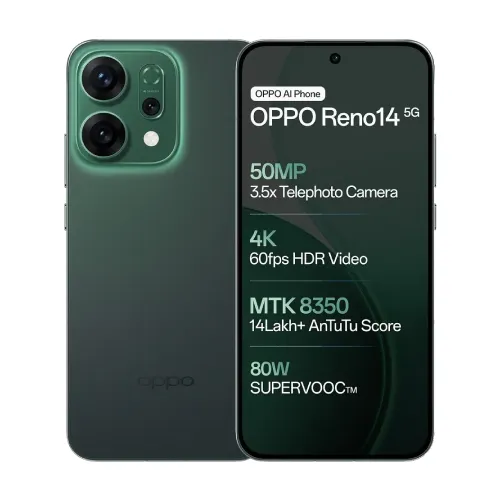 The OPPO Reno14 5G is a premium smartphone that offers a perfect blend of style, performance, and innovative features. It boasts a stunning 6.59inch FHD+ AMOLED display with a 120Hz refresh rate, providing an immersive viewing experience. Powered by the Mediatek Dimensity 8350 chipset and an octacore processor, the OPPO Reno14 delivers seamless performance and efficient multitasking.