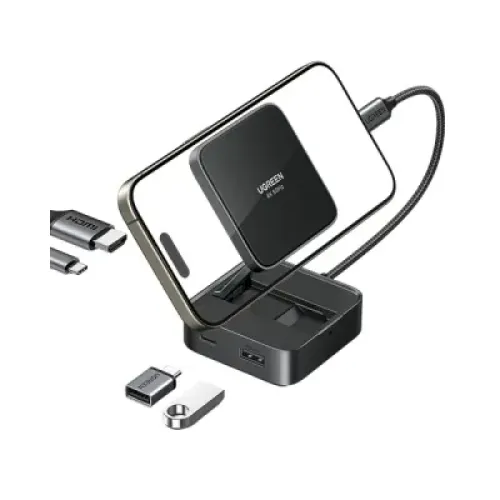 Elevate your mobile workspace with the UGREEN CM801 4in1 Multifunction TypeC Hub. This sleek, compact hub transforms your iPhone 15/16 series or MagSafecompatible device into a versatile workstation, perfect for professionals and techsavvy users onthego. Enjoy blazingfast 5Gbps data transfer via USBA and USBC ports, 100W PD passthrough charging, and stunning 4K@60Hz HDMI output for seamless streaming, multitasking, and presentations.